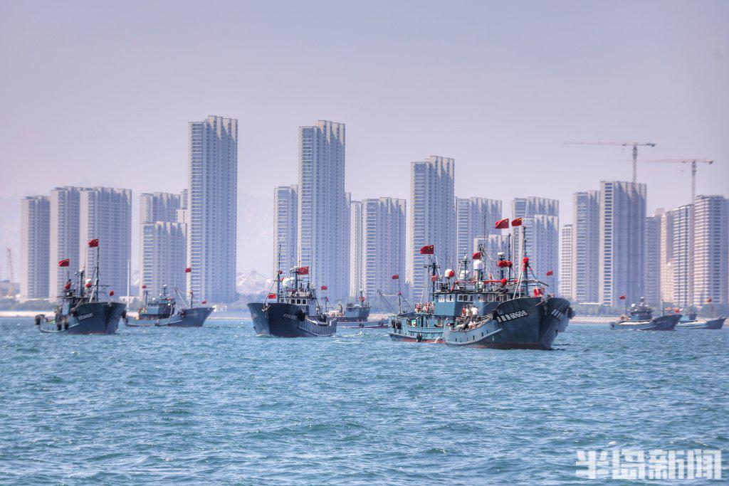 开海时间到,大量渔船开足马力,争先恐后驶出胶州湾。