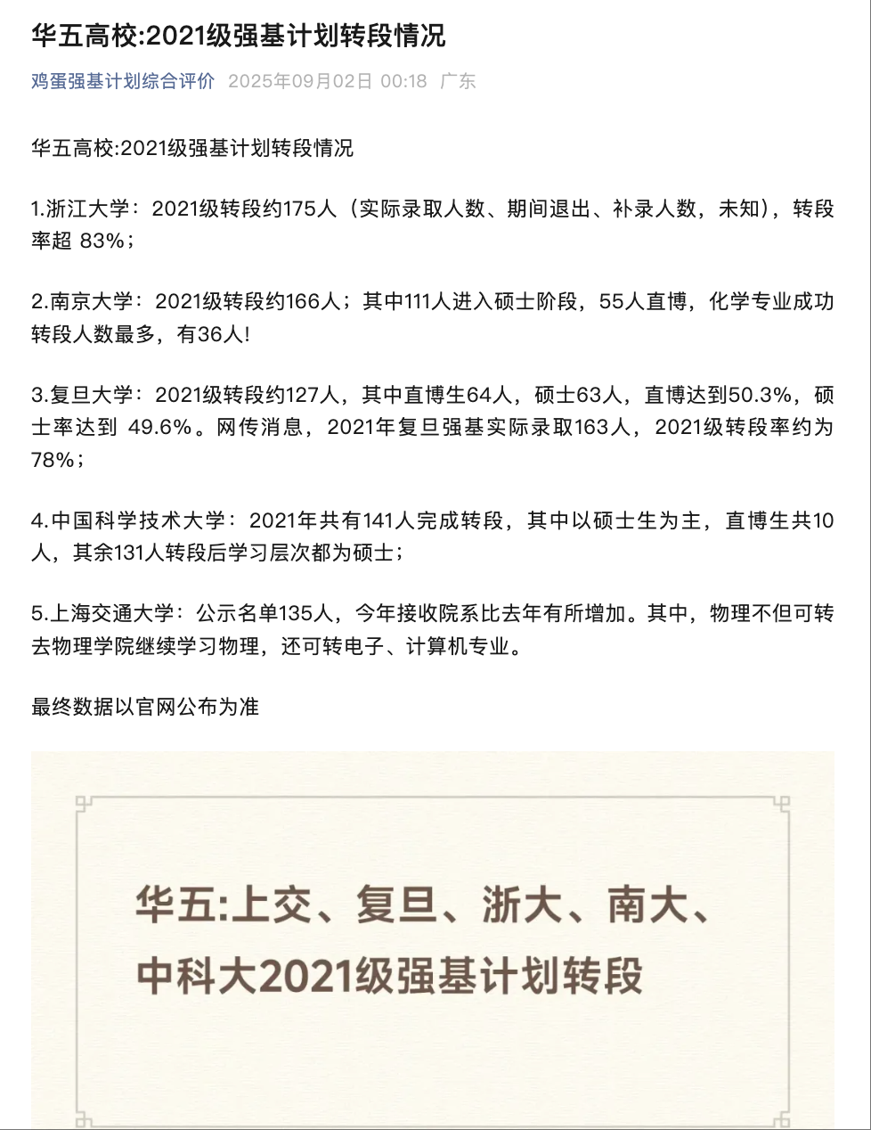 2.南京大学:2021级转段约166人;其中111人进入硕士阶段,55人直博,化学专业成功转段人数最多,有36人!