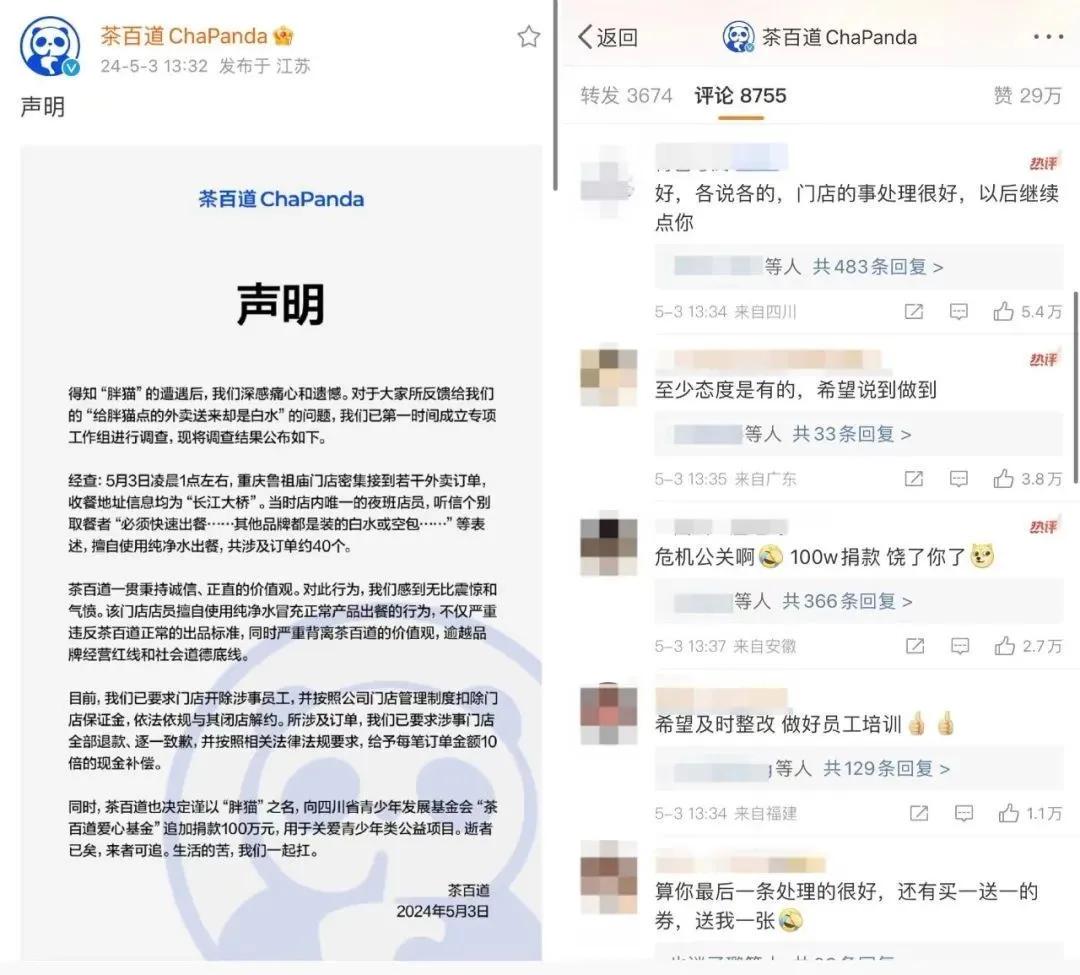 即便茶百道在第一时间进行道歉、捐款并且开除了涉事员工,但茶百道“品控差、门店操作不规范”的印象已经很难挽回了。