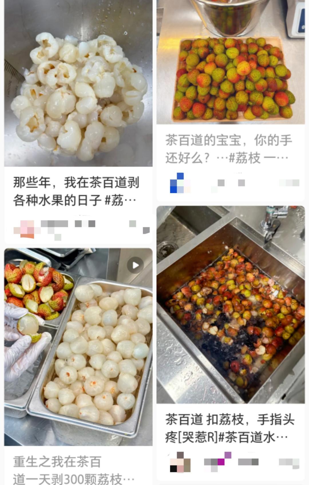 而在6月份荔枝口味异军突起后,茶百道也迅速跟上,推出了鲜荔枝系列,还打出“现场现剥”的噱头,逼疯了不少店员。