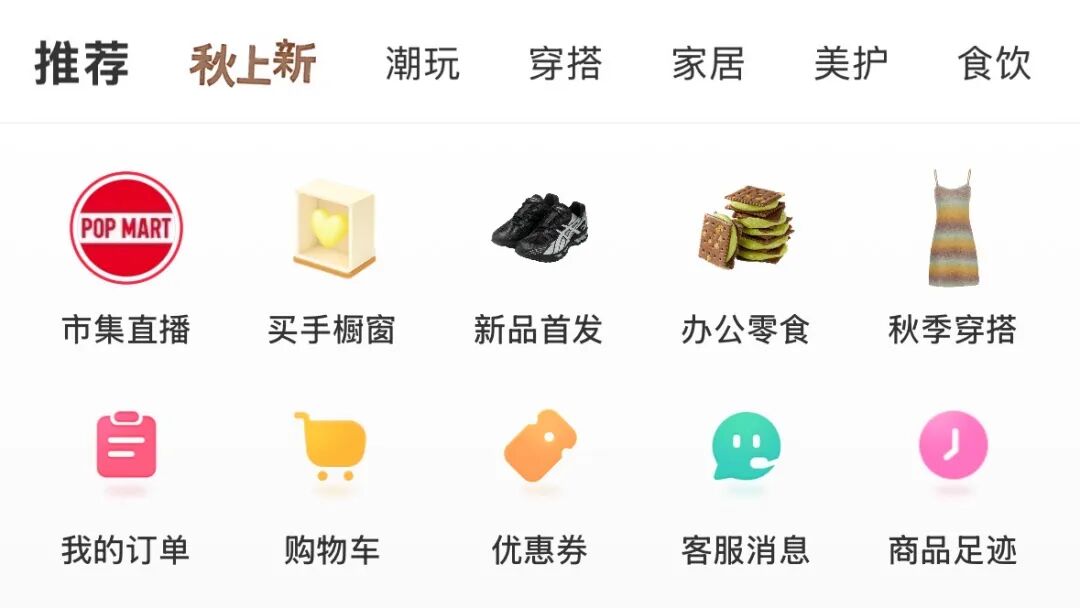 打开 “ 市集 ”,其依旧采用了双列信息流,从形式上看和 App 社区主页区别不大,内容上通过商品信息页、直播和商品笔记的混排进行填充。
