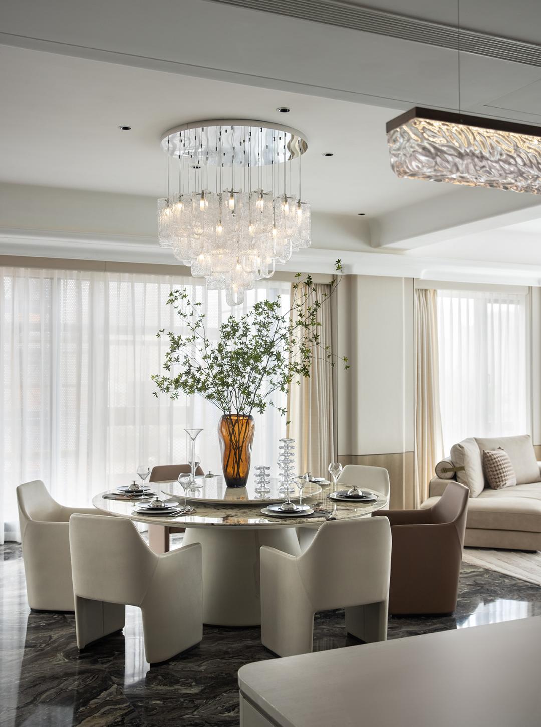 建面约325㎡孟也作品,则以线条柔化空间边界,新艺术护墙板与石材组合演绎材质美学。