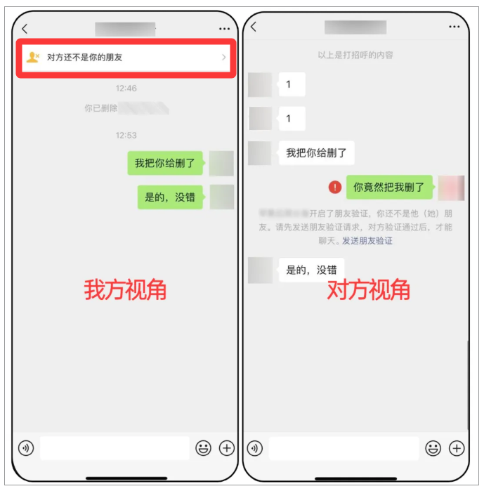 在聊天界面中,界面会弹窗提示“已删除联系人”,聊天框上方会有小字提示“ 你已删除xxx”,界面顶部会提示“对方还不是你的朋友”。