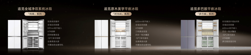 追觅冰箱此次发布会可谓是做足了准备,同步推出极境、纯境、多巴胺和时光屿四大产品系列,构建完整的高端市场覆盖体系。极境系列作为技术旗舰,集成了超低氧恒鲜科技,AICooling智能营养管理系统和纯平嵌入式设计;纯境系列专注全域净双系统,锁鲜不串味;多巴胺系列面向年轻消费群体,多彩个性化时尚设计;时光屿系列东方自然原木风格主打轻奢人群,充分满足不同消费群体的个性化需求。