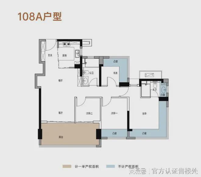 108㎡四房两厅两卫:竖厅布局,四开间朝南,主卧与次卧享 270° 环幕飘窗,约 6 米景观阳台连通客厅与次卧,得房率高达 106%,兼顾功能性与舒适性。