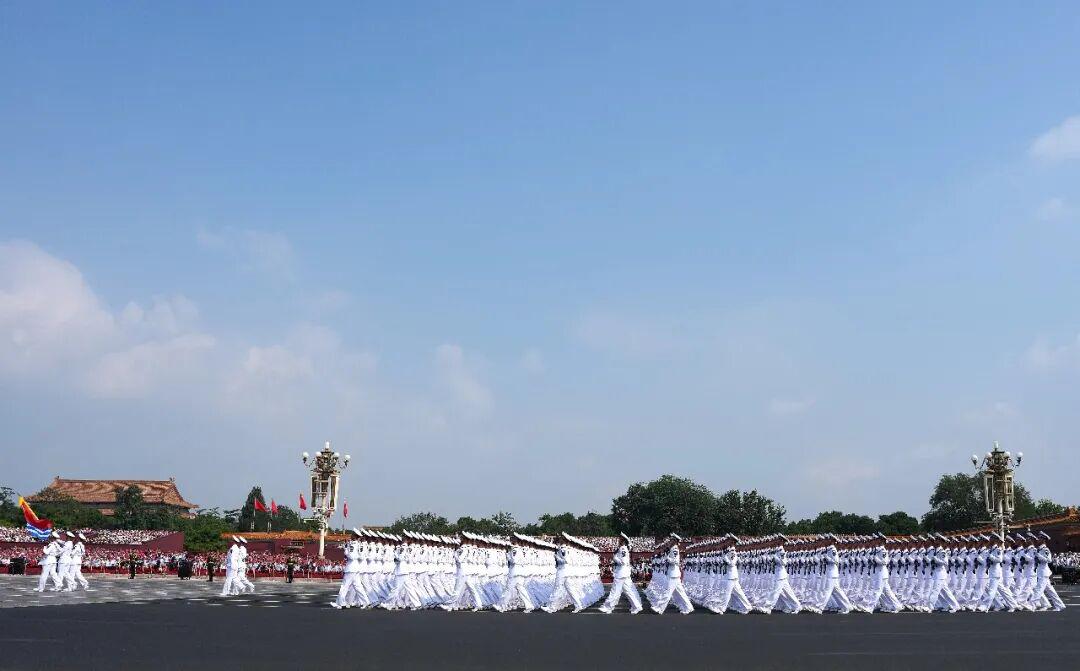 记者周荻潇(左二)在高点拍摄阅兵方队