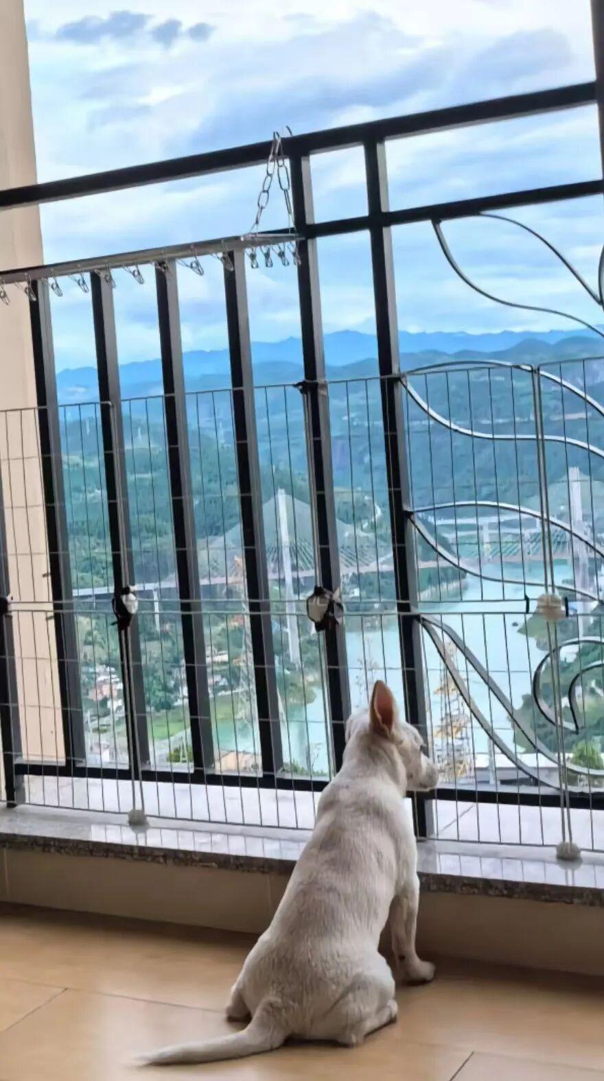 狗子在阳台上看风景,结果翻了个身,整只狗处在一个非常尴尬的位置。