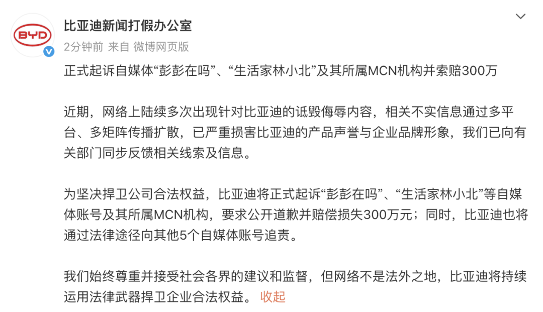 9月4日,@比亚迪新闻打假办公室发文称将起诉“彭彭在吗”“生活家林小北”等自媒体账号及其所属MCN机构,要求公开道歉并赔偿损失300万元。