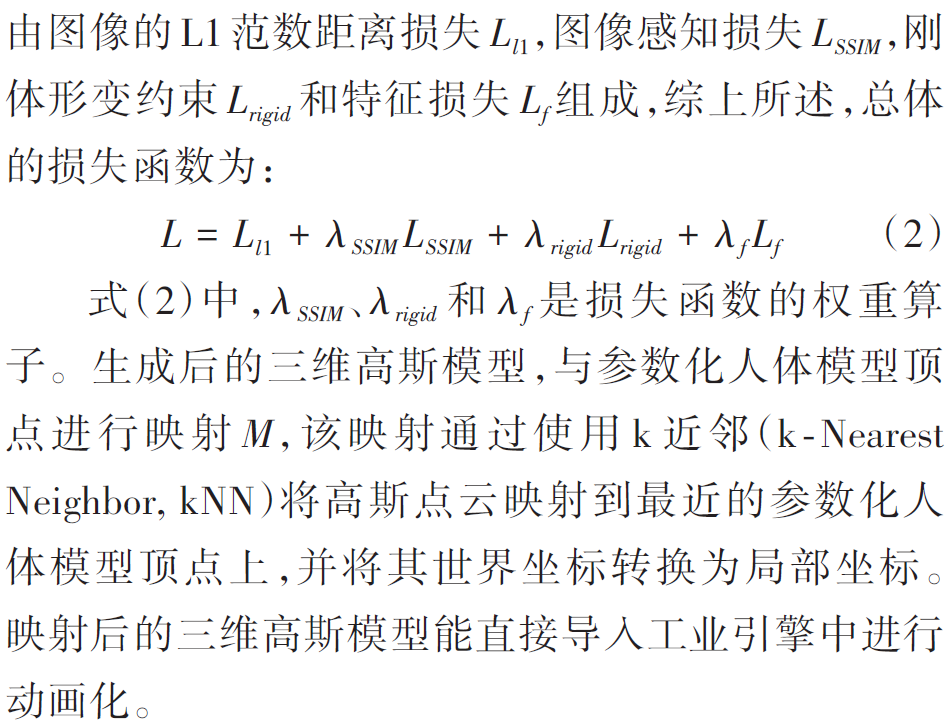 为追求更高的渲染效率,新技术将原有的神经辐射场(NeRF)模块,替换为三维高斯泼溅(3DGS)表示方法。Qian等[19]利用可学习的蒙皮权重控制局部高斯点的变化,使其能在45分钟左右重建出高精度的人体模型。Hu等[20]采用参数化人体模型的UV纹理作为姿态特征以生成高斯点云,可实现通过姿势识别实时控制人物模型的变换。但上述方法都无法直接迁移至当前的渲染管线中。Splatting Avatar[21]将高斯点与三角形网格面绑定,并在表面上附加平移,可实现直接导入渲染引擎中使用并控制。Moon等[22]将参数化人体模型的顶点编码到三平面空间,并使用高斯作为纹理表示,该方法具备对人体姿态和面部表情进行动画控制的能力。以上方法为之后在电影工业中快速迭代虚拟预演(PreViz)场景和素材提供了有效的技术支撑。