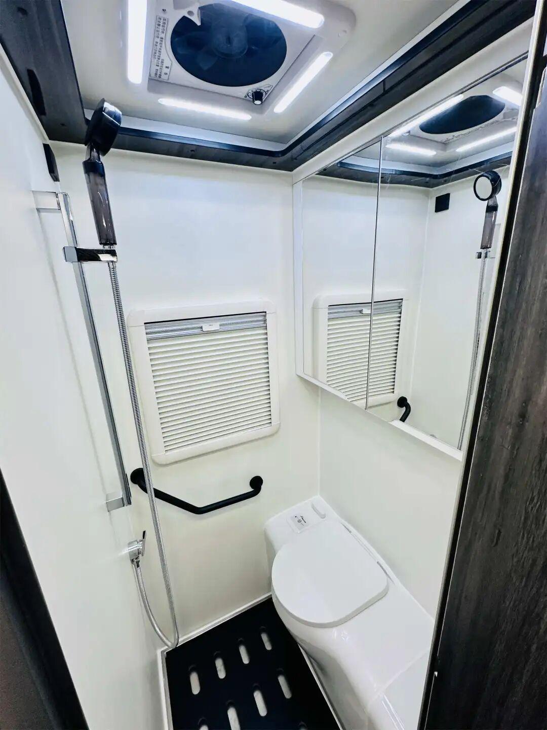 卫浴间采用进口淋浴系统与抽拉式花洒,配备抽屉式马桶与高档水槽。水电配置堪称行业标杆:230升清水箱搭配70升灰水箱,12V 1200Ah锂电池组通过10块太阳能板实现日均3.6kWh的能量补给。特别搭载的10kW D-MAX热水器与4kW比来弗暖风机,可在-15℃环境下维持24小时恒温热水供应。