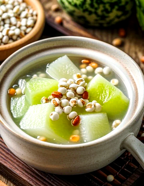 薏苡仁性微寒、味甘淡,是著名的健脾祛湿要药;冬瓜性微寒、味甘淡,是夏季瓜果中的祛湿高手,能清热止渴、利水消肿。二者搭配,特别适合应对夏季湿气困脾导致的头身困重、食欲差、水肿等症。