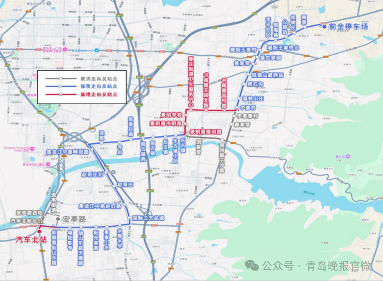 取消站:李家曹村(双向)、郝家营(双向)、银河路王沙路(双向)、刘家营(双向)、东古镇(往前金停车场方向)、汽车北站北门(往安亭路方向)、安亭路西站(往安亭路方向)、流亭街道(往安亭路方向)、安亭路(往安亭路方向)。