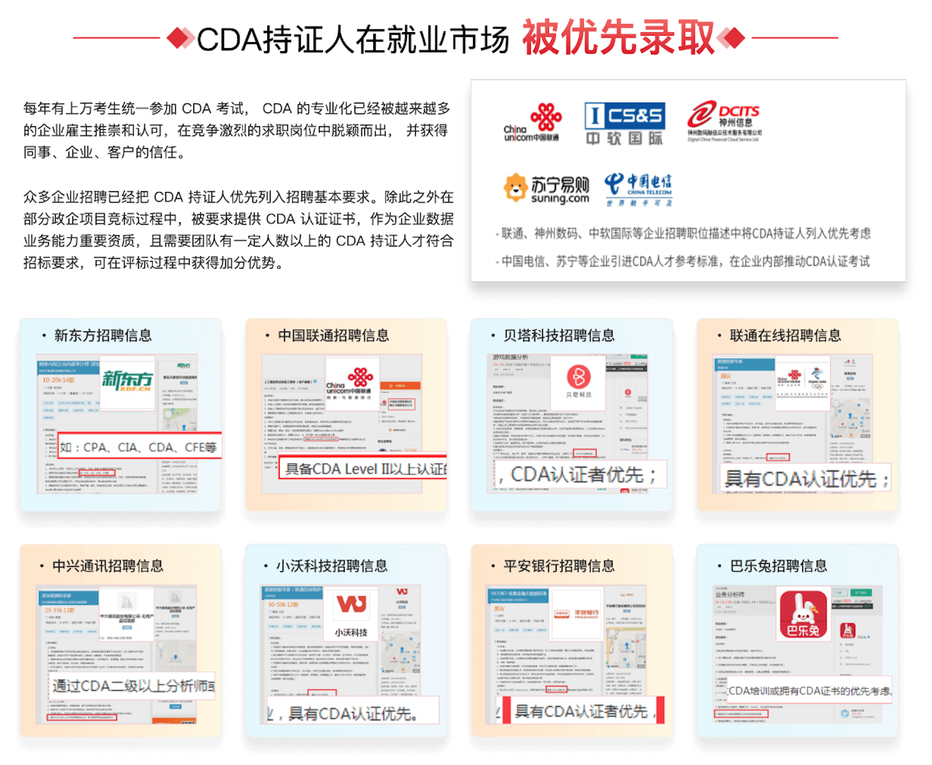 ✅CDA企业认可度如何?CDA企业认可度非常高,很多企业招聘时注明CDA数据分析师优先,对找工作非常有帮助。很多银行、金融机构的技术岗会要求必须是CDA数据分析师二级以上的持证人。