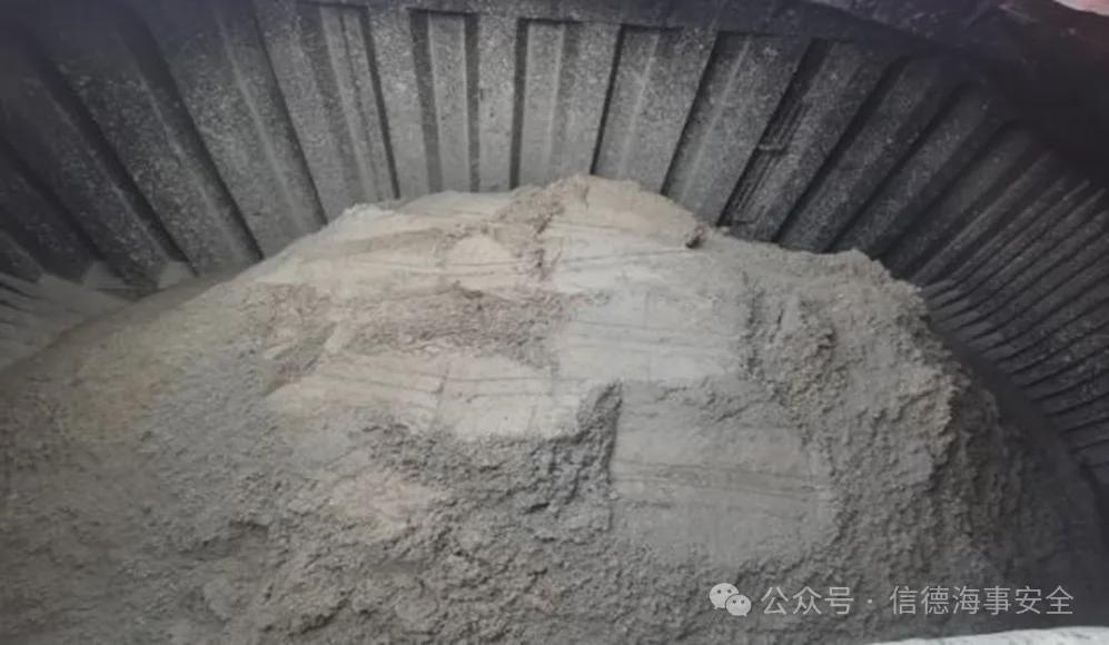 图2.由于船体运动,货物压实,造成水分向货堆底部移动。一旦货堆内部任何部位的水分含量达到了临界值,作用在货物上的动态力会导致水分流向最近的角落/舱壁/墙边界处压力较小的货堆表面。随着水继续流动,货物中的水分与固体货物分离,在货舱角落处形成几滩自由液面水。与图1中刚装上船时的货物相比,此时货堆底部的固体货物和货舱中央的货堆变得较为干燥。可以看到,货堆表面形成的裂缝。