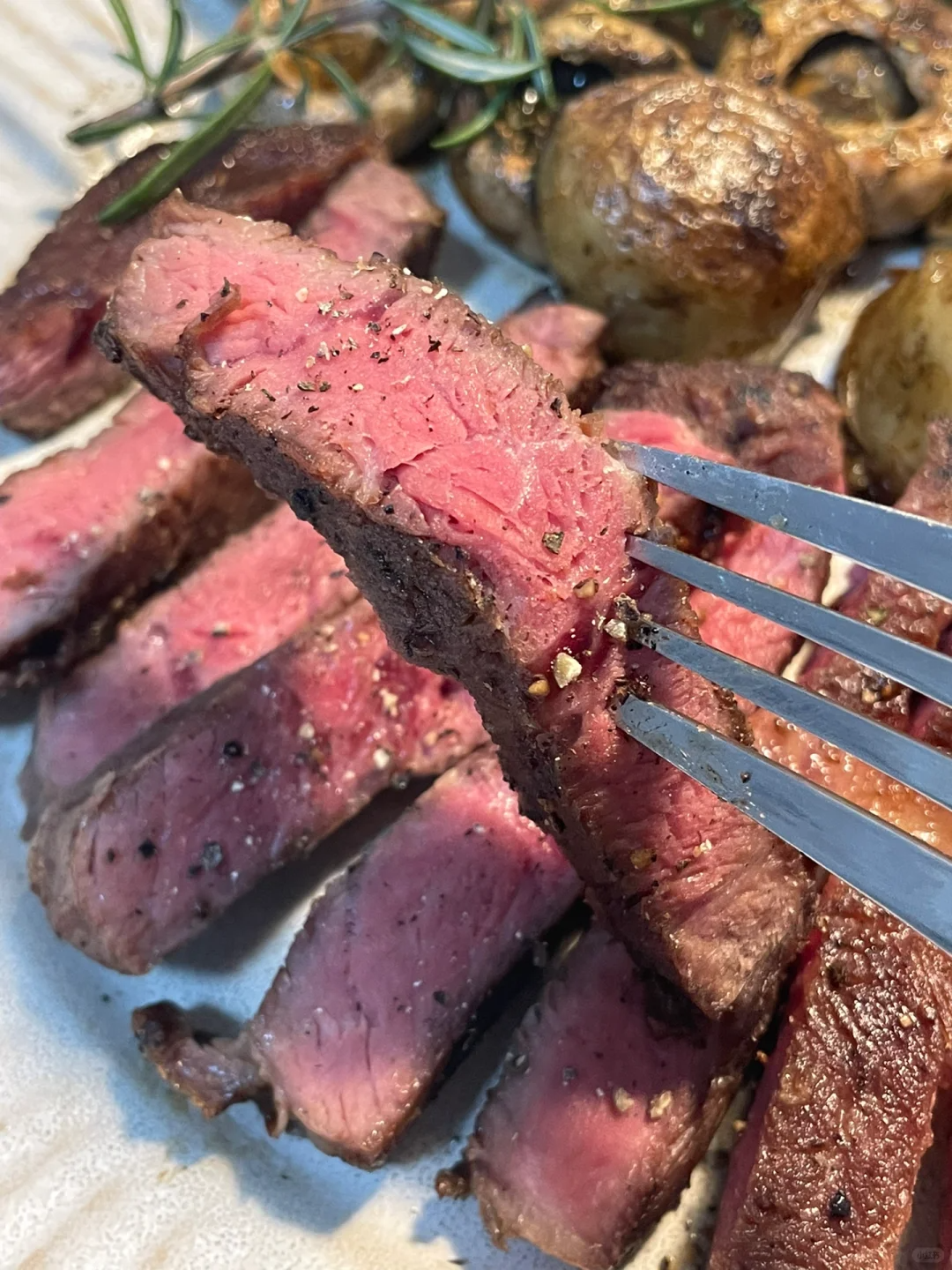 4⃣️转小火加黄油+大蒜+迷迭香等配菜,将融化的黄油反复淋在牛排上30秒,出锅后静置5分钟再切
