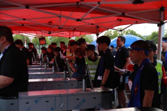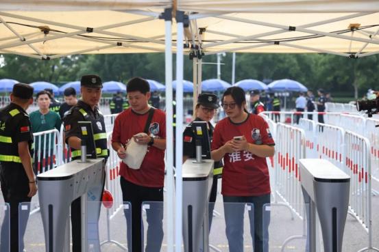 淮安公安科学设置预检、验票、人身安检、物品查验4大环节,流程清晰,职责明确。VR全景导览指引提前上线,设置64个人脸闸机﹑60个PDA人工验证通道,同时自主开发快速验证小程序,增加60个二代证核验通道进行补充,在确保绝对安全的同时,极大提升了通行效率,让球迷得以秒级入场,以最短时间到达场内座位。