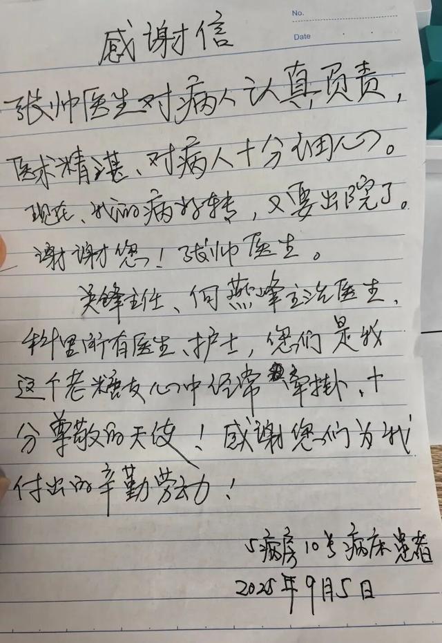 信纸虽薄,却承载着厚重如山的感激与信任。邓奶奶多年来因糖尿病并发症数次入院,此次治疗期间,吴锋主任带领团队不仅以精湛医术精准调控病情,更在每一个细微处灌注真诚关怀:从量身定制的饮食建议,到不厌其烦的血糖监测;从严谨的用药指导,到温暖的心理疏导——他们用专业与耐心,编织起一道充满温度的守护网,让邓奶奶在病痛中感受到如家人般的陪伴与安心。