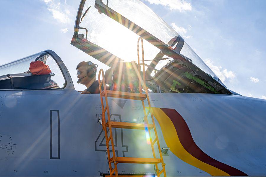 机务人员对歼-15T舰载机进行飞行前的检查。