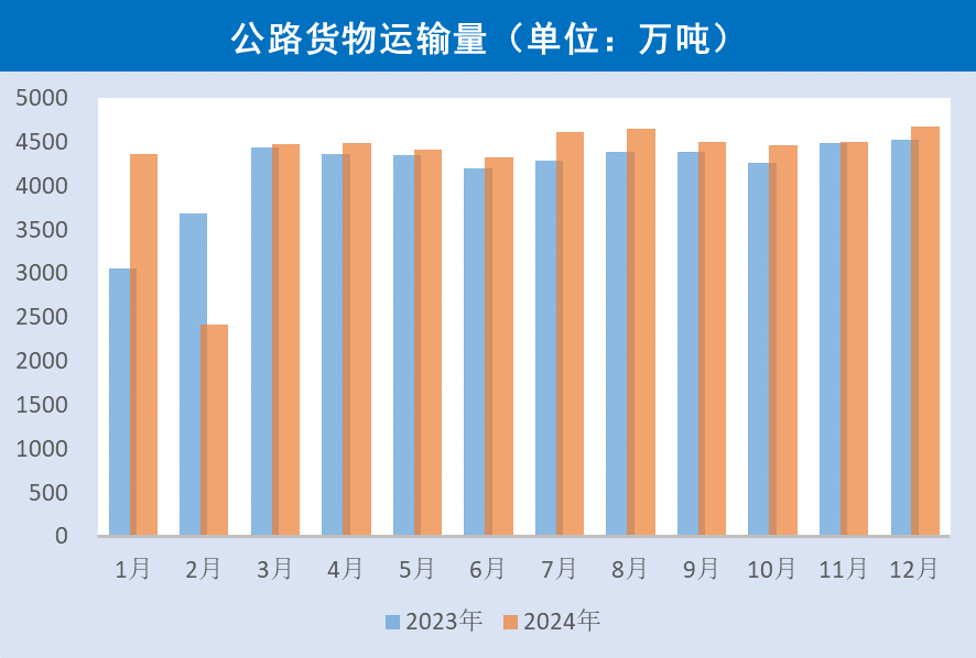 2024年公路货物运输量5.2亿吨,同比增长2.9%。公路货物运输量占比为33.3%,同比增加0.4个百分点。