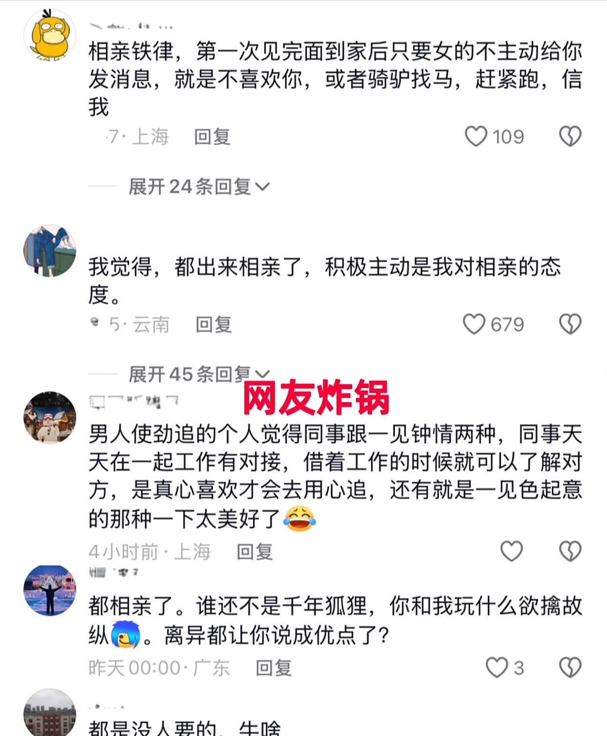 也有人调侃:“都2025年了,你还在装清纯装矜持。又不是没谈过恋爱,主动一下会死吗?照你这个年龄,想找好对象,还要对方主动,做梦吧!”