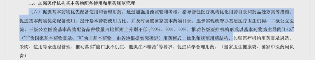 国务院办公厅印发《关于进一步做好短缺药品保供稳价工作的意见》明确提出,促进基本药物优先配备使用和合理用药。并要求逐步实现政府办基层医疗卫生机构、二级公立医院、三级公立医院基本药物配备品种数量占比原则上分别不低于90%、80%、60%。