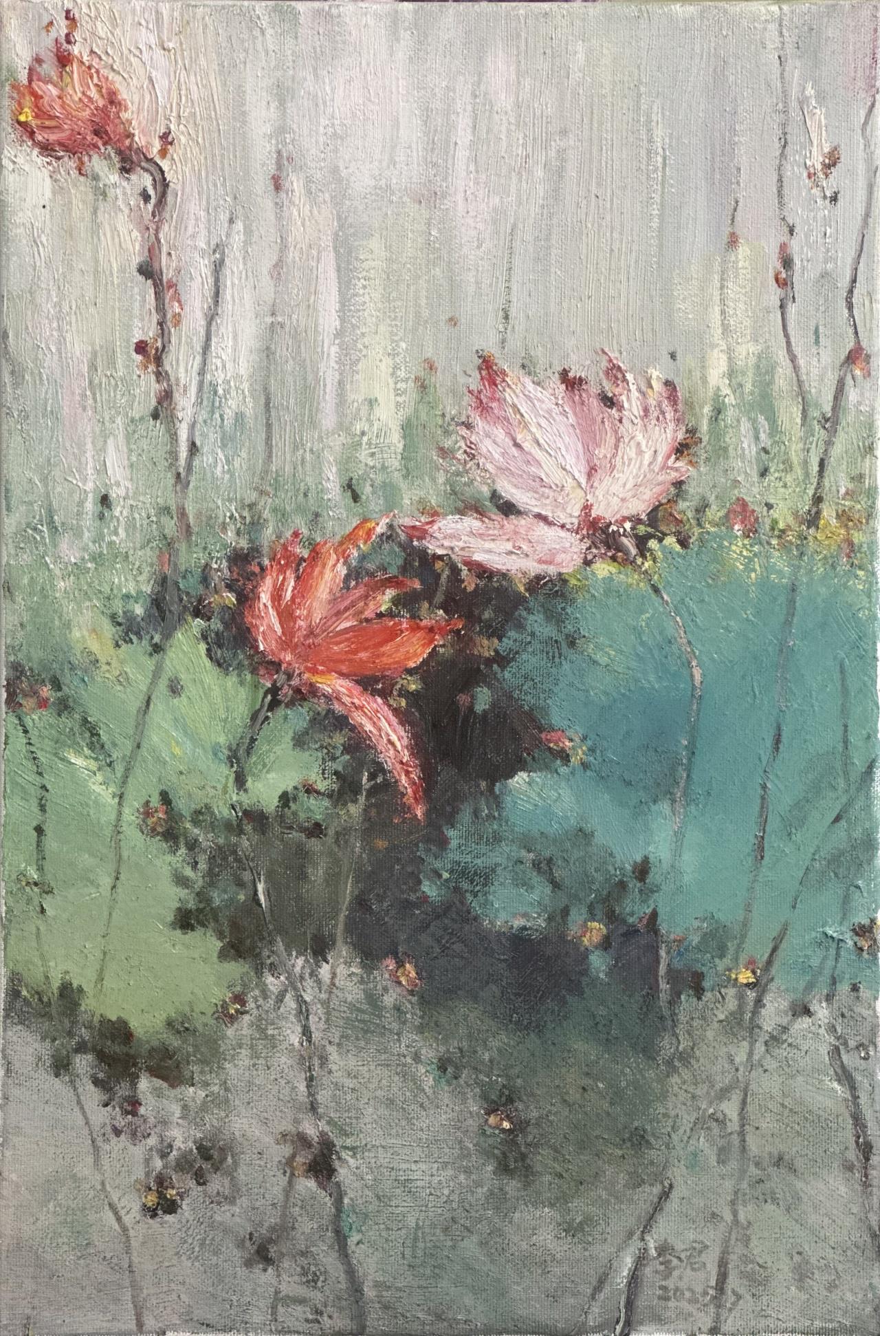李君的创作多以花卉静物与风景为题材,笔下物象并未走向完全写实,而是带有表现主义意向。