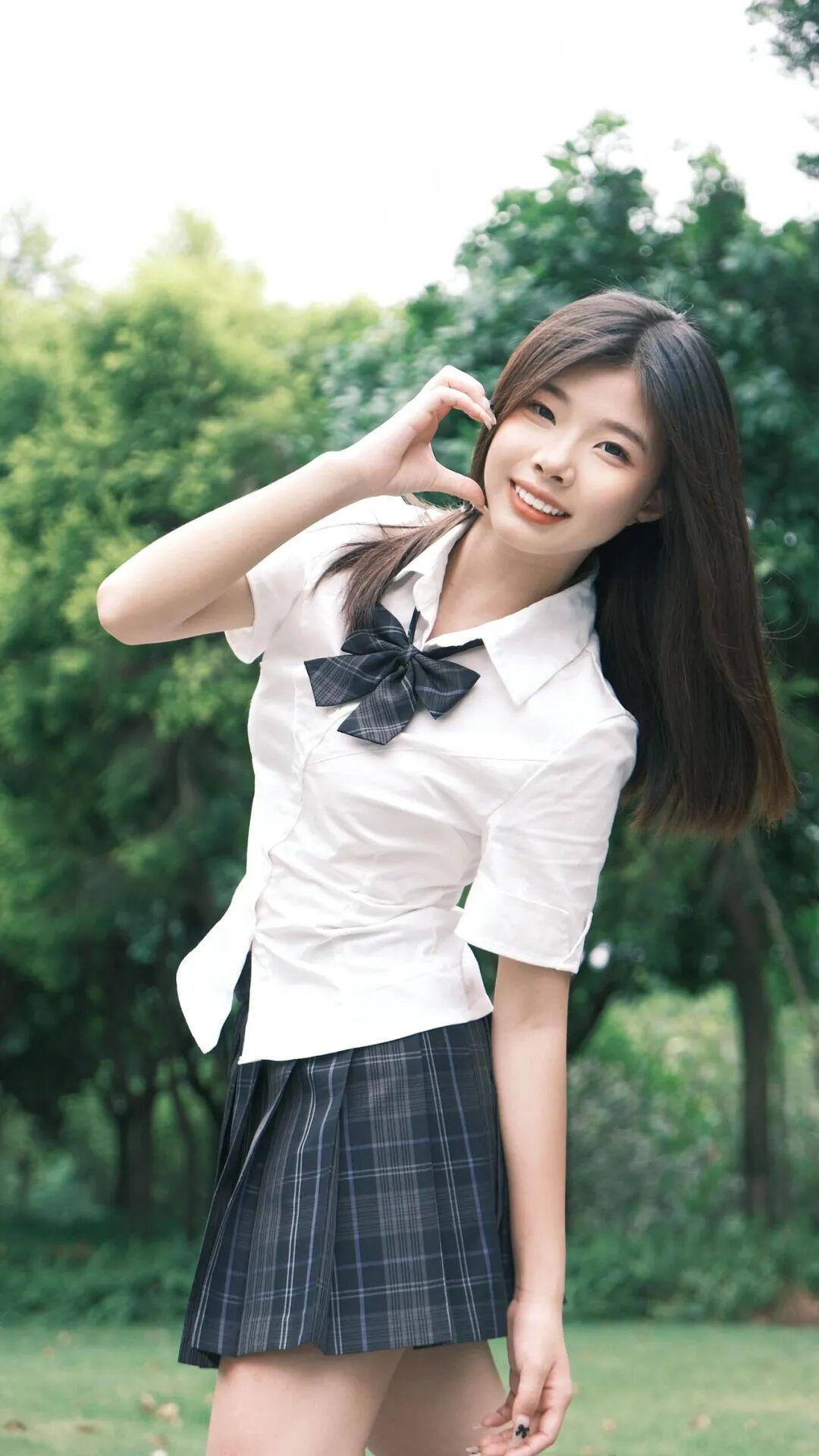 人物在绿意环绕的草地旁,用手比出爱心靠近脸颊,还略带俏皮地侧身站立,这姿势也太会了!既靠手势传递了甜美情绪,又借侧身线条打破了呆板感,把校园风的灵动与少女的娇俏融合得恰到好处。不用纠结动作多复杂,这种带点小互动又自然舒展的姿势,随手一拍都是甜度超标的青春大片~