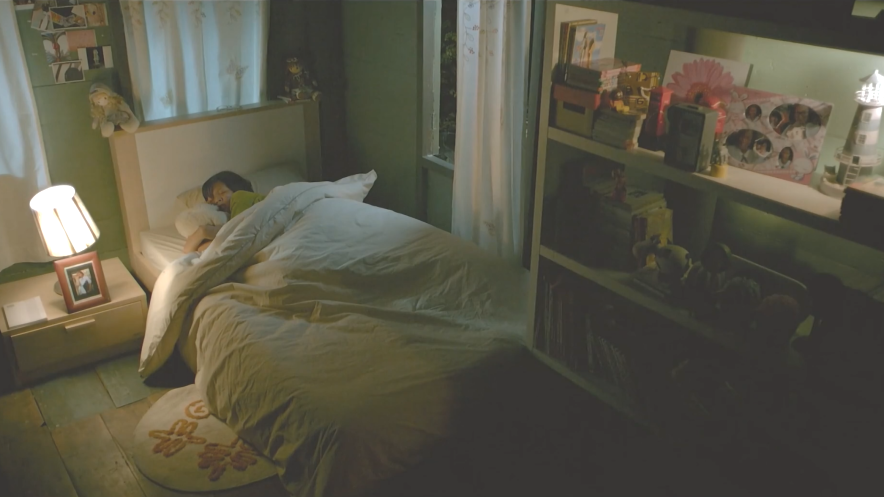 《初恋那件小事》则展现了东南亚中产家庭的少女房间:木制书桌上放着电风扇与塑料笔筒,花格玻璃窗外是一片湿漉漉的绿意。这个带有青春气息的空间既简陋又温柔,完美承载了热带少女成长的静谧日常。