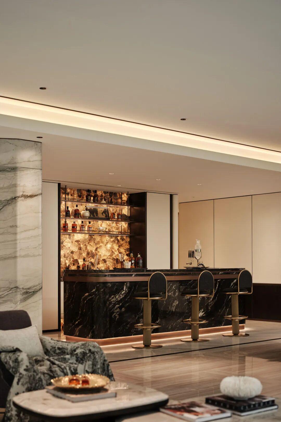 行政酒廊的釉面陶土板接待台以琉璃瓦为灵感,暗藏秦汉宫廷基因;私宴厅白色烤漆屏风如盛唐画卷舒展,梅里雪山大理石台面与黑金木饰面碰撞出宋式极简美学;这里设计有西安首个豪宅壁球馆、可容纳20人的私董会客厅、普拉提空中瑜伽室、红酒雪茄吧等12大功能空间。