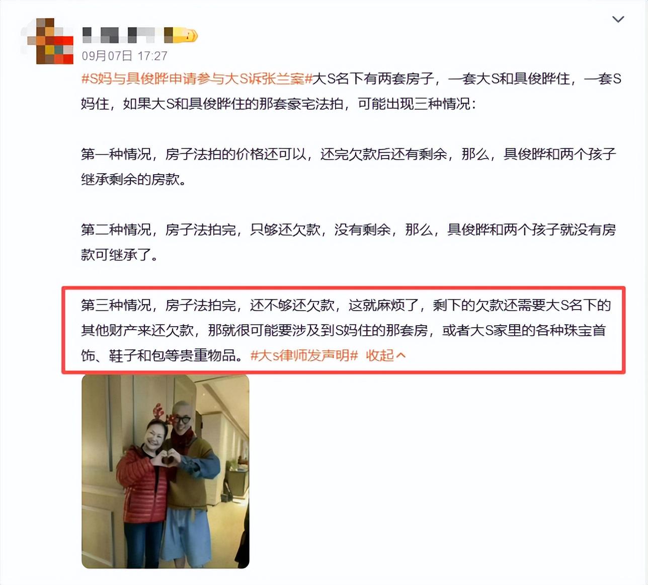 如果大S名下的贵重物品不够的话,可能就需要S妈住的那套房子来抵。