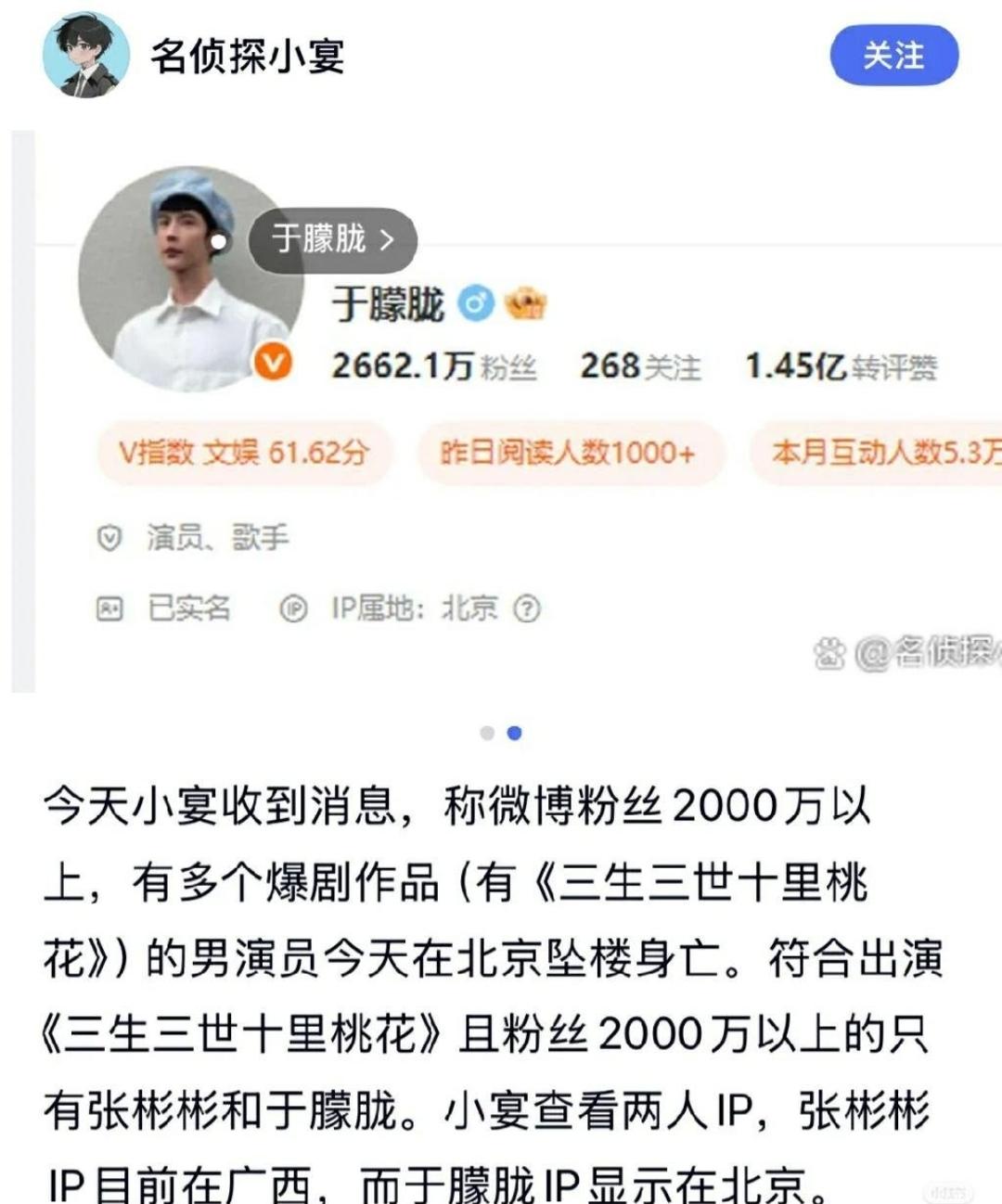 据悉,是狗仔“小宴”在网上发文爆料,称某位“粉丝2000万”的男演员出事,在北京坠楼身亡。