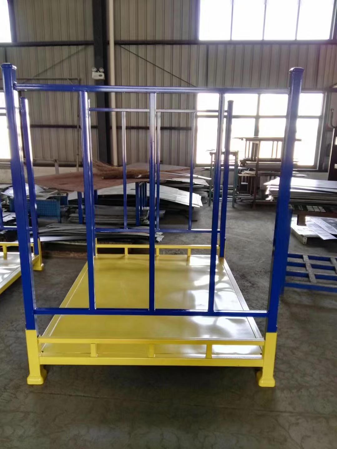 折叠式堆垛架具有可折叠、可堆垛的特点,底部框架与加强筋采用50*50*1.5方管,护栏加强筋由25*50*1.2方管制成。这类堆垛架承载能力可达1.25吨至1.5吨,可堆垛3层,不用时可以拆卸下来堆叠套在一起,节省空间。折叠式堆垛架适用于租赁仓库、低矮的老式仓库或车间暂存区等不适合投资货架的区域,可有计划地对货物进行定量存储,分拨与配送。