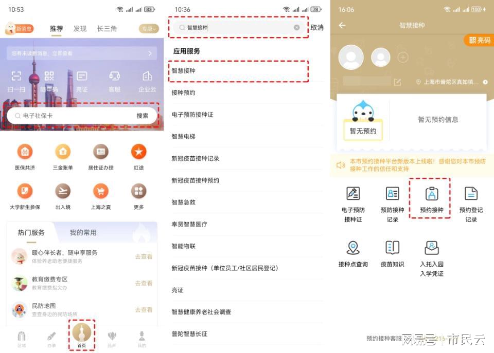 登录“随申办市民云”APP→首页搜索框中输入关键字“智慧接种”→点击“智慧接种”进入预约页面;
