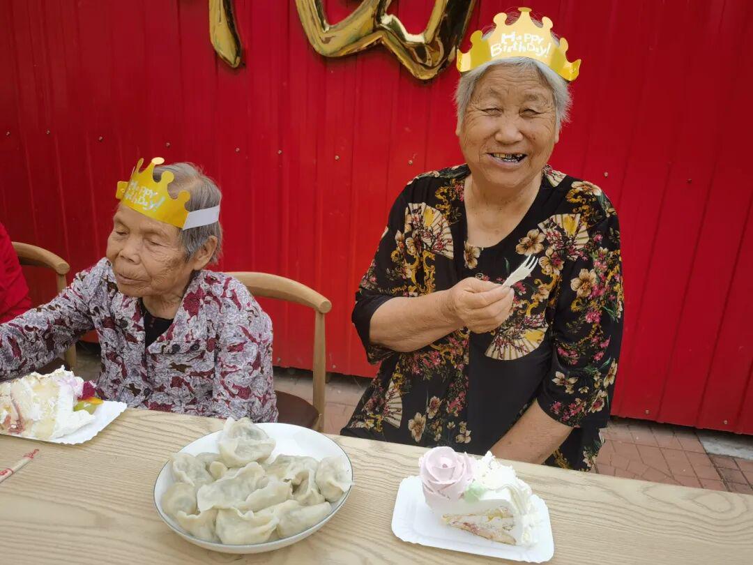 当天还是四位长者的生日,大家一起为寿星们举办了温馨的庆生仪式。志愿者帮老人们戴上金光闪闪的寿星帽,细心搀扶他们坐到生日蛋糕桌前。大家围在身旁,全场合唱生日歌表达祝福。待老人吹灭生日蜡烛后,志愿者们便开始分切蛋糕。他们熟练地将蛋糕切成适口的小块,仔细装盘后分送到每位老人手中。老人们品尝着甜美的蛋糕,脸上洋溢着幸福的笑容。