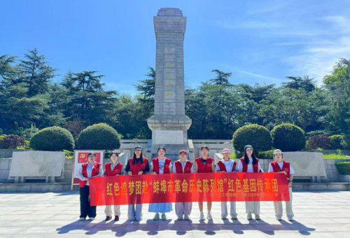 二、青春悼先烈 从陈列馆出来,引入眼帘的,是一节节台阶,而台阶上的墓碑上写着“革命烈士永垂不朽”,烈日炎炎,也挡不住我们走上台阶的脚步。在巍峨的纪念碑前,我们身着红马甲整齐伫立,“红色追梦团赴‘蚌埠市革命历史陈列馆’红色基因传承团”的横幅,如同一面旗帜,串联起历史与当下的炽热情怀。