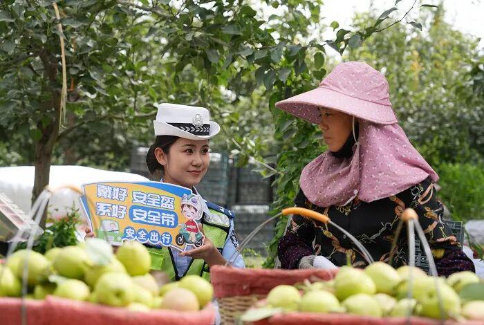 活动中,宣传小分队走进梨园基地与正在劳作的群众一起说秋收、话安全。针对采收季常见的农用车违法载人、人货混装、货车超载运输等突出违法行为,民警通过发放宣传手册、现场讲解等方式,详细说明此类行为的安全隐患与法律后果。同时,着重讲解了在运输梨子过程中的交通安全注意事项,如车辆的合法装载、安全驾驶技巧等,教育群众在发展经济、赚钱养家的同时,也要时时谨记道路交通安全法律法规,平日不坐违法车,也不开违法车,赚钱很重要,生命更可贵;切莫存侥幸,平安值万金。