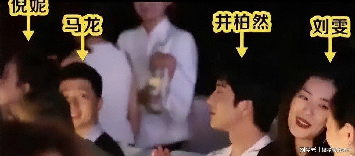 倪妮和井柏然的中间坐着乒乓球运动员马龙,而井柏然的旁边还坐着他的现任女友刘雯。
