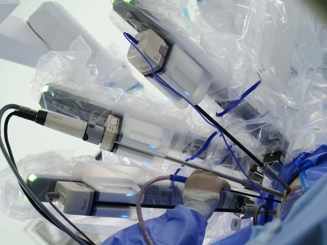 手术当天,3D高清电子内窥镜进入患者胸腔后,病灶区解剖结构如3D电影般清晰呈现。杨洋熟练操作机器人机械臂探查胸腔,明确肿瘤位置及范围后,精准游离肺粘连带,依次处理与左下肺叶相连的血管和气管,完整切除肿瘤并清扫周围淋巴结以降低复发风险。全程用时不到3小时,出血不到10ml,最大程度保留了患者左肺功能。