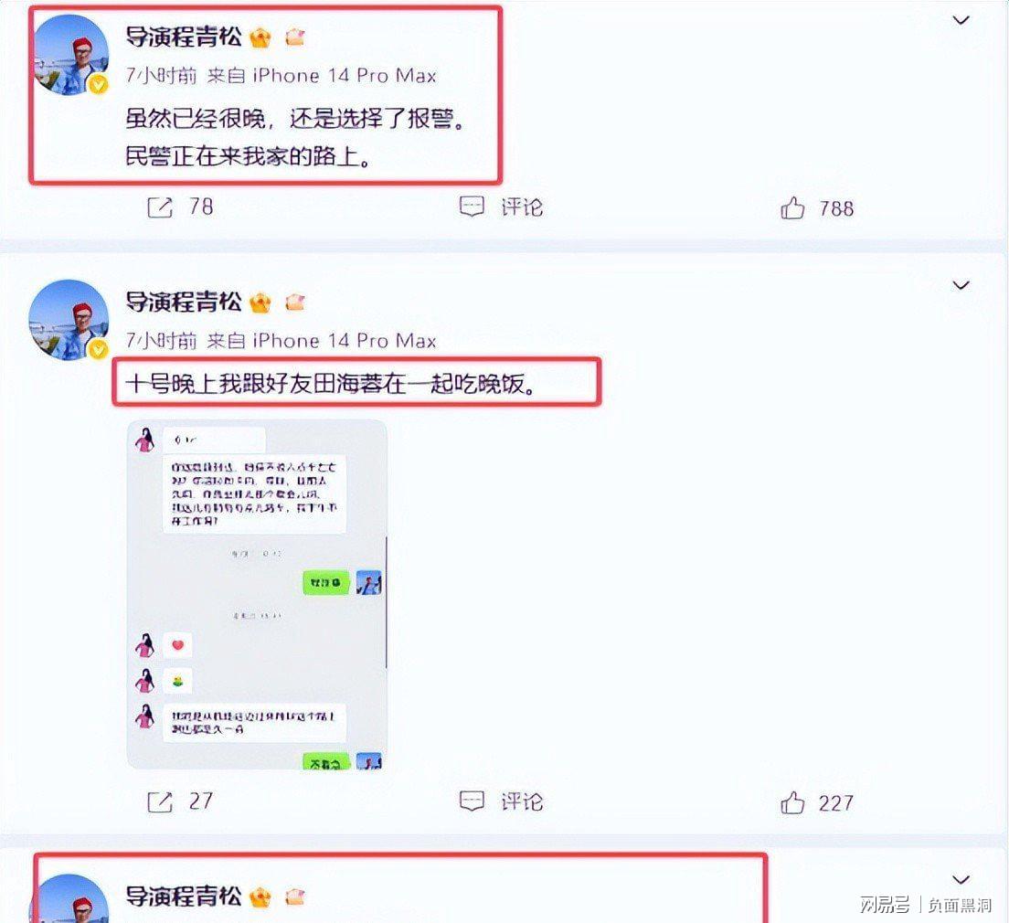 最先作出反应的是导演程青松,他直接晒出10号晚上和田海蓉约饭的聊天记录,时间显示是六点四十,还强调自己这几年一直是红发,跟现场流出的两名男性照片完全对不上。