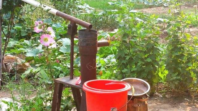后来家家户户都打了井,将一根钢管插入打好的小孔井中,上面装个压水机,就成了压井,压着压井把手就能从下方的水井中抽出水来,不停地压,水就源源不断地流出来!