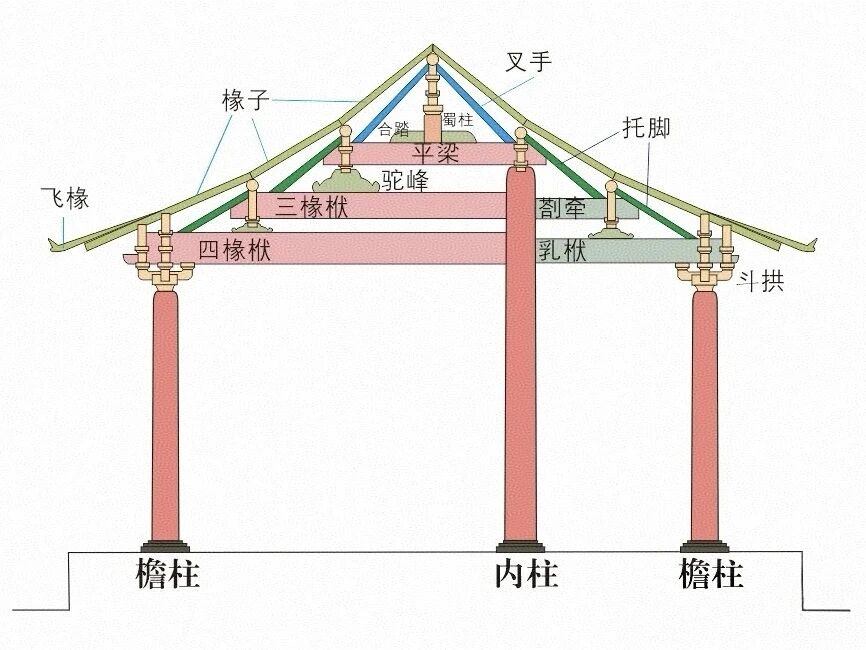 1.结构分工:中国传统建筑以木柱、梁、枋等构成主体承重框架,墙仅作为围护结构,不承担屋顶重量。即使墙体倒塌,木构架仍独立支撑建筑。
