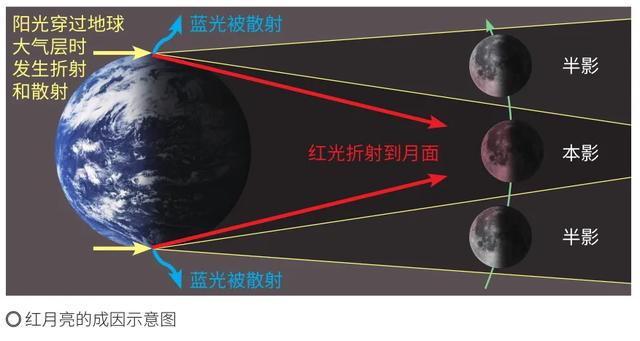 反之只有当它完全被地球挡住,接受不到太阳光直射时,地球大气折射的红色光才会被凸显,形成难得一见的“血月”。