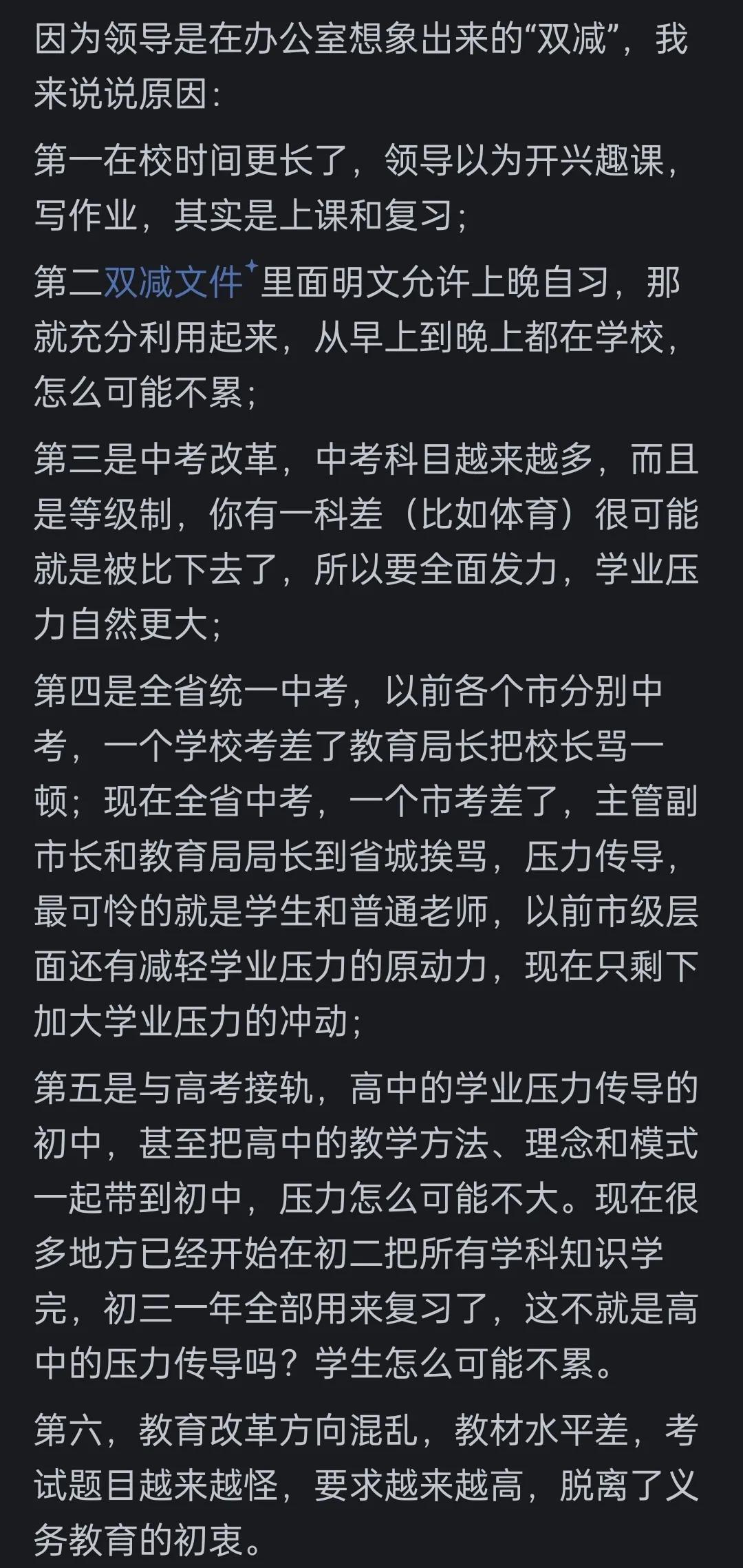 双减让有上进心的孩子以及父母在只能在家自己摸索提高成绩的路上过考研班的人应该深有体会。考纲上罗列一堆知识点,考研班老师会点评,这个点至多出个选择,那个点从来不考,这个点是重中之重。觉得双减之后累,就是因为没老师帮忙划重点了,只能大范围抠书本刷题。