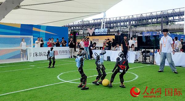 在服贸会体育服务展区,机器人踢足球吸引观众驻足。人民网记者 吴凯摄