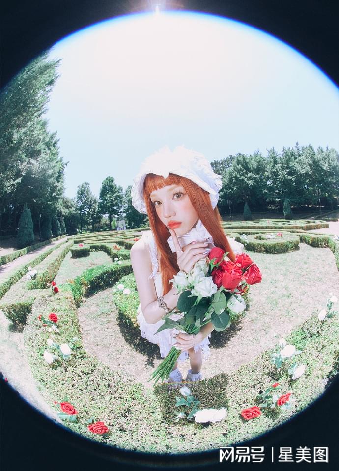 再看花园里的画面,她戴着白色的蕾丝帽,穿着白色的裙子,手里拿着红玫瑰,周围是精心修剪的绿植和盛开的花朵,用鱼眼镜头拍出来,整个场景就像童话里的秘密花园。她在花丛中穿梭、停留,好奇又可爱,仿佛是花园里的小公主,充满了梦幻的感觉。