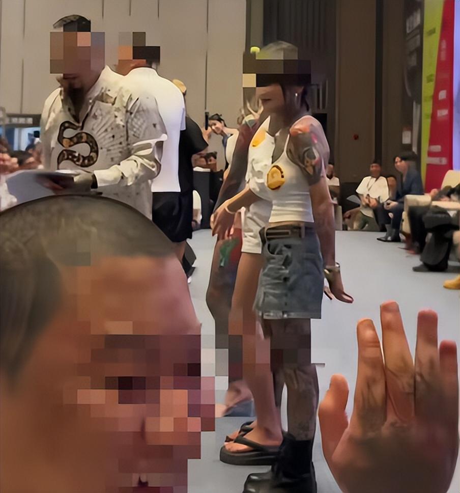 随后,没过多久展秀就开始了,从曝光的画面中可以看到,由于要露自己身上的纹身,所以参赛者穿着很是清凉,他们各自排好队,走到舞台上,等待评委们的点评。
