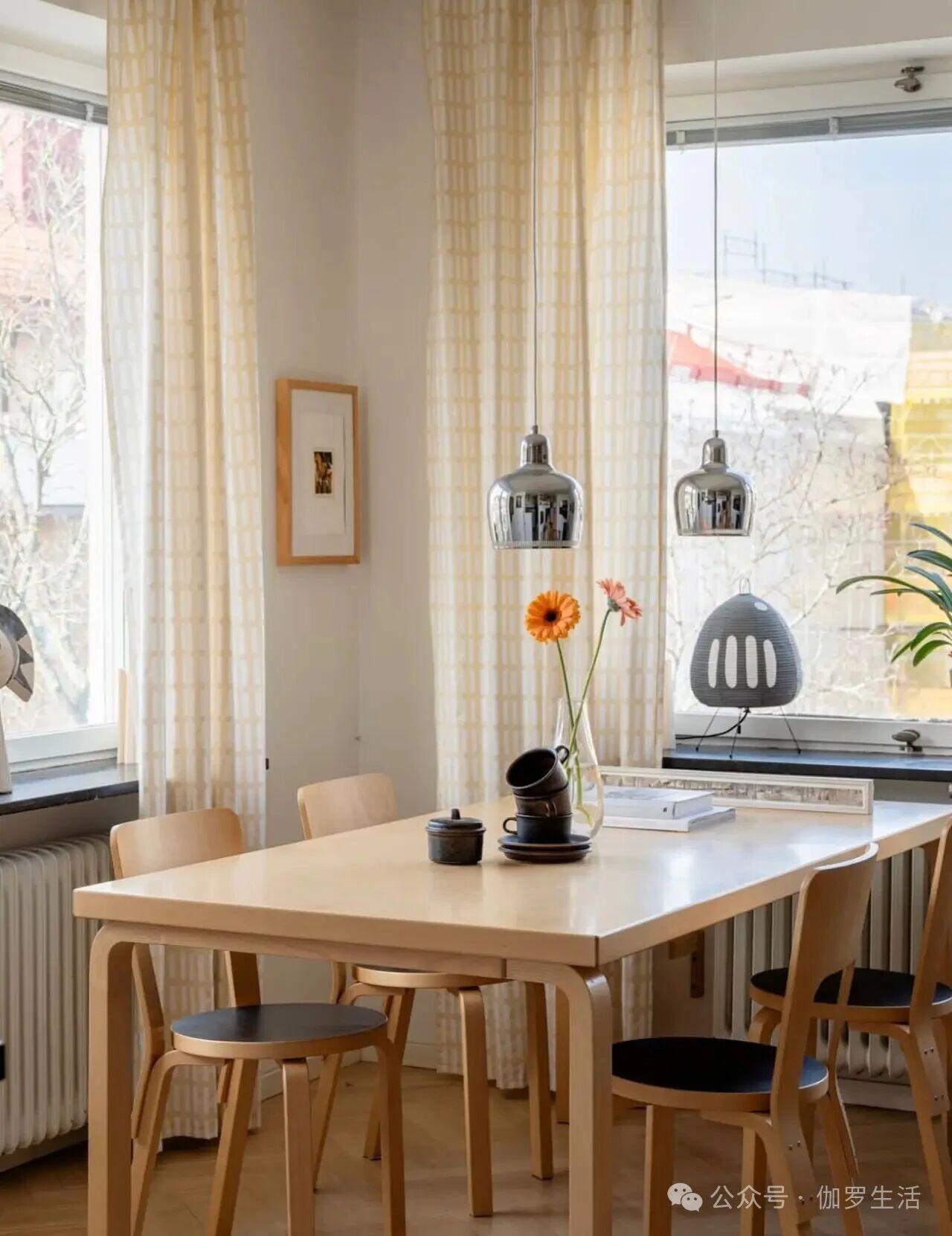 阿尔托的银色金钟吊灯和野口勇的和纸吊灯、台灯搭配阿尔托的家具,格外谦逊、低调、友善。