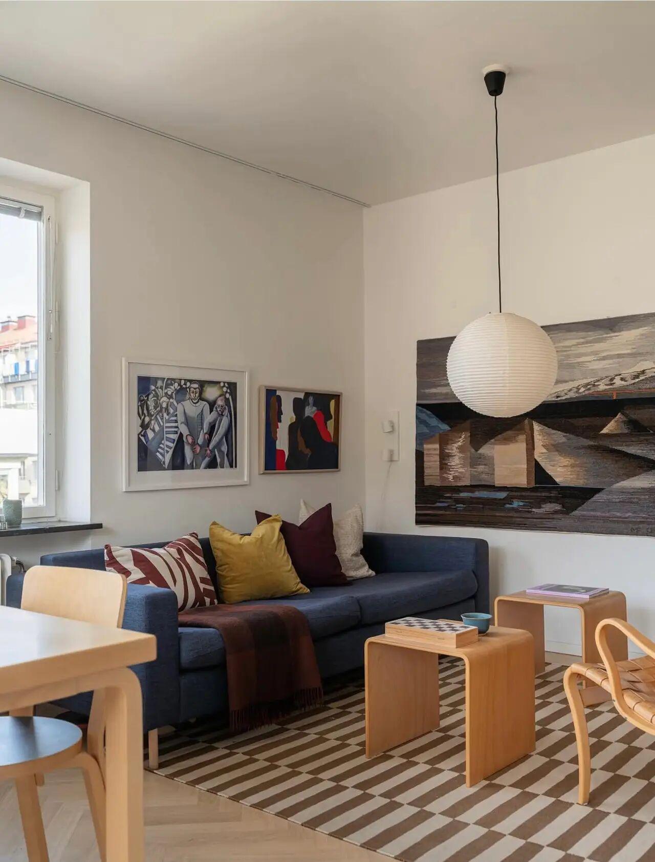 家中不能没有色彩,所以屋主搭配了阿尔托设计的西恩纳印花的地毯,还有拼色块的羊毛地毯,让空间活泛了起来。