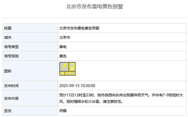 预计15日12时至23时,北京市自西向东将出现雷阵雨天气,并伴有7-9级短时大风、短时强降水和小冰雹,请注意防范。