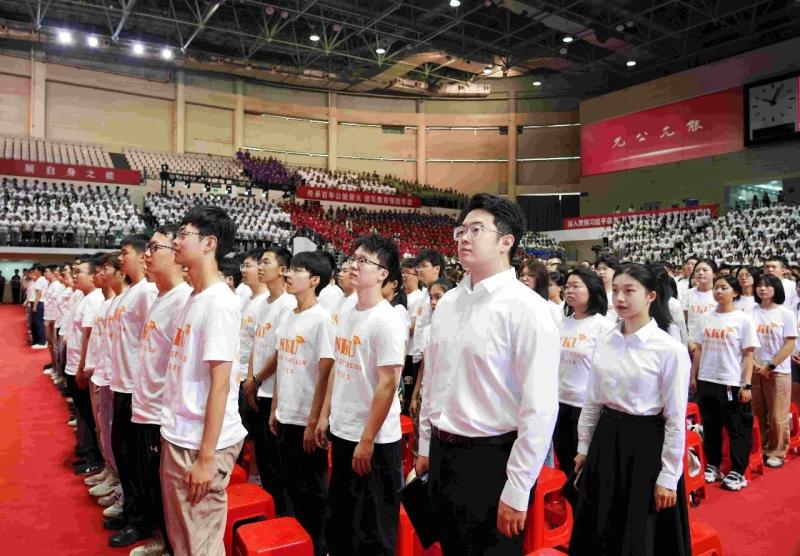 “渤海之滨,白河之津,巍巍我南开精神。汲汲骎骎,月异日新,发煌我前途无垠……”开学典礼在全体师生齐声高唱南开校歌中圆满礼成。